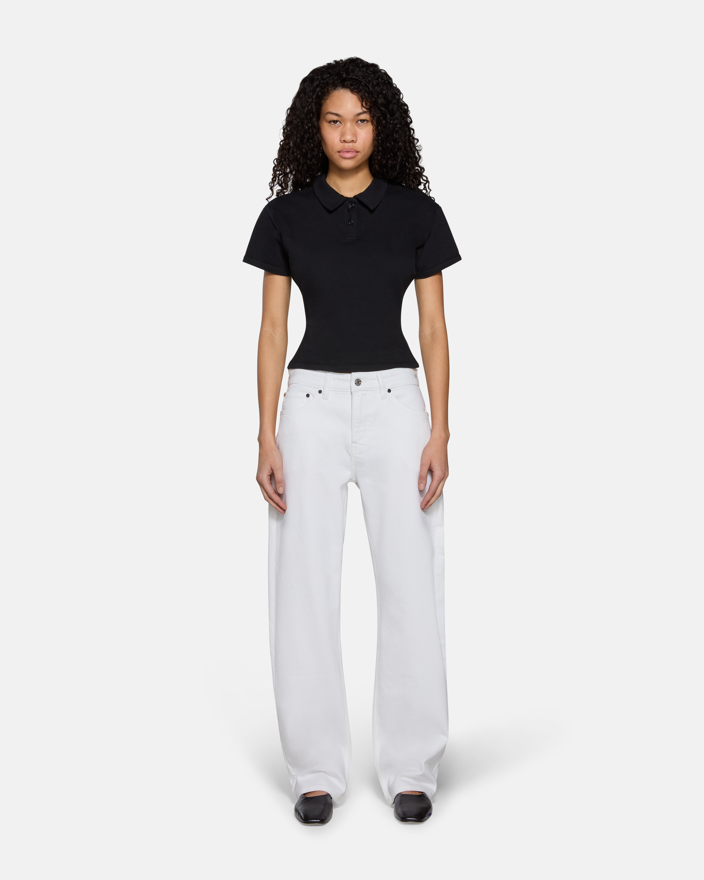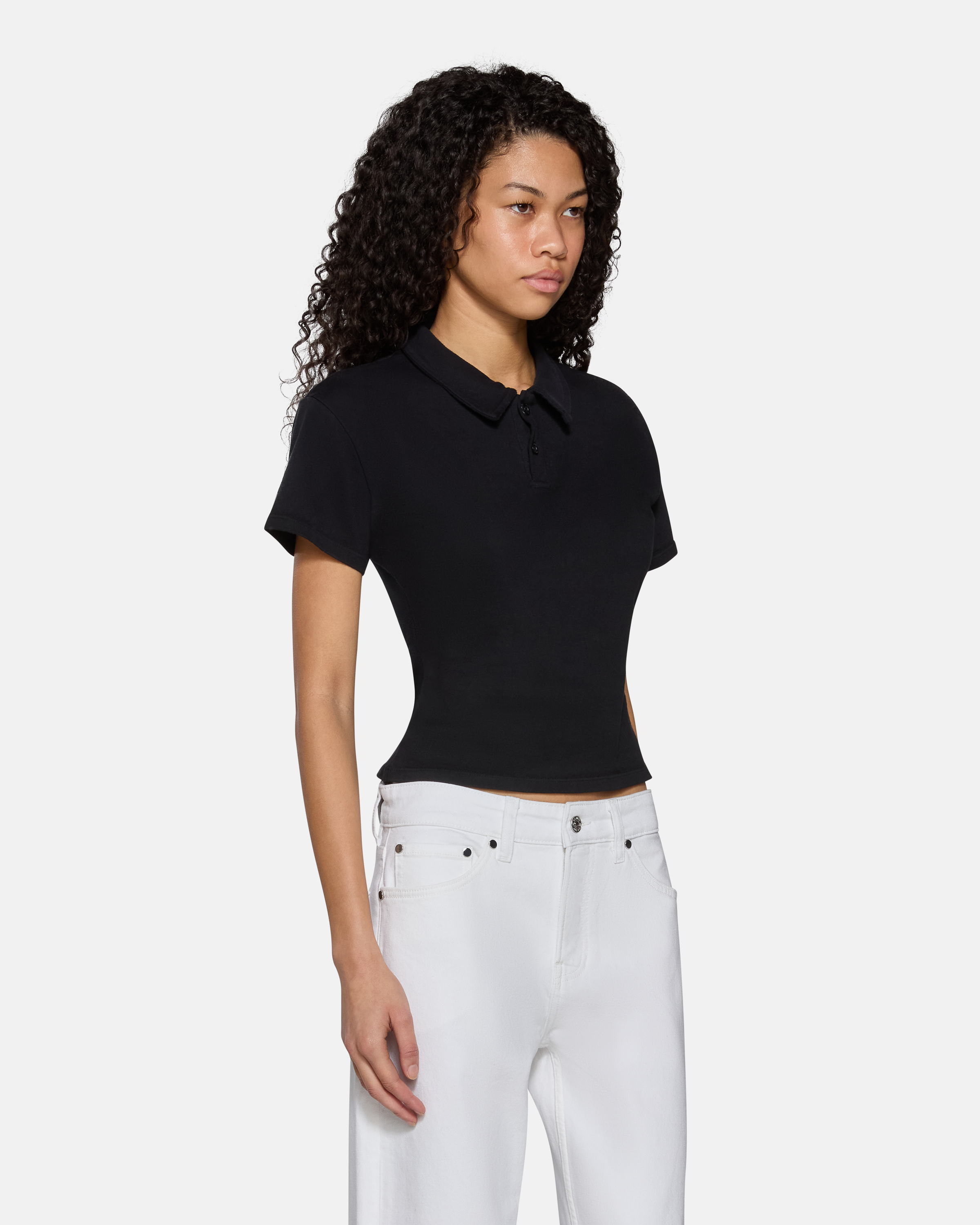 Our Eero Polo Tee is built off the body of our Eero Tee, featuring a button-up collar and EB’s signature cinched waist for a flattering shape. Fits true to size. Finished with the signature EB Denim spine seam.